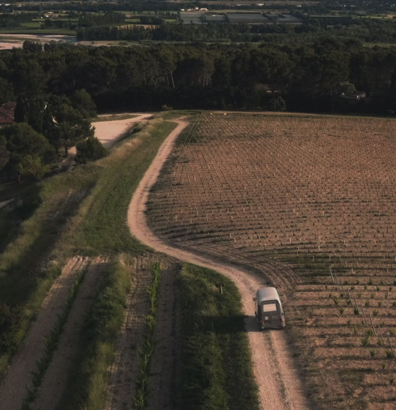 Et il n’est pas rare de la retrouver, le auvent fièrement relevé en direction du sud sur les hauteurs du domaine, accompagnant une dégustation privée au milieu des vignes.
